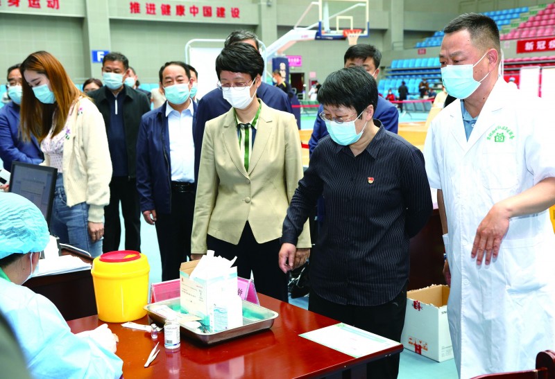 圖為于濤(右二)一行在東營市墾利區(qū)新冠病毒疫苗接種點檢查疫苗質(zhì)量安全情況。
