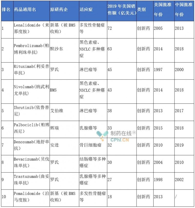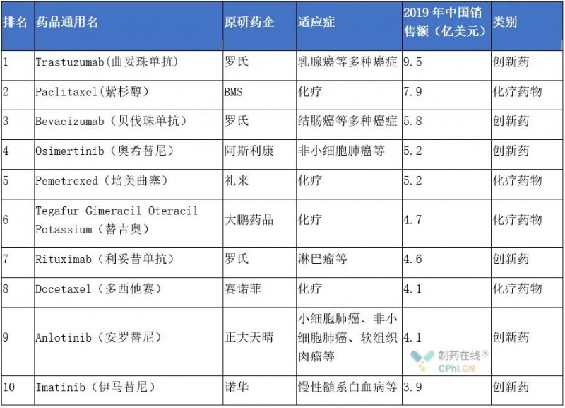 2019年中美十大暢銷抗腫瘤藥對比