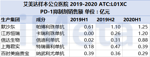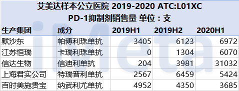 截至目前,在艾美達(dá)樣本公立醫(yī)院中,國內(nèi)已上市6種PD-1抑制劑,2019-2020有銷售數(shù)據(jù)的共5種。