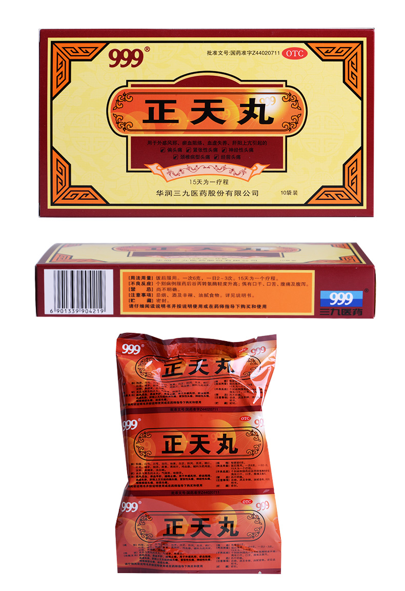 999 三九 正天丸 6g*10袋 1盒 用于外感風邪 、淤血阻絡、血虛失養(yǎng)、肝陽上亢引起的偏頭痛、緊張性頭痛、神經(jīng)性頭痛、頸椎病型頭痛、經(jīng)前頭痛