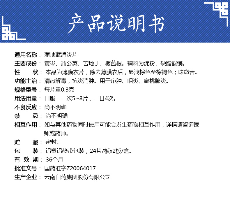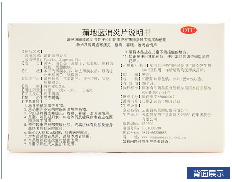 云南白藥 云豐 蒲地藍消炎片 48片(消腫 咽炎 扁桃腺炎)
