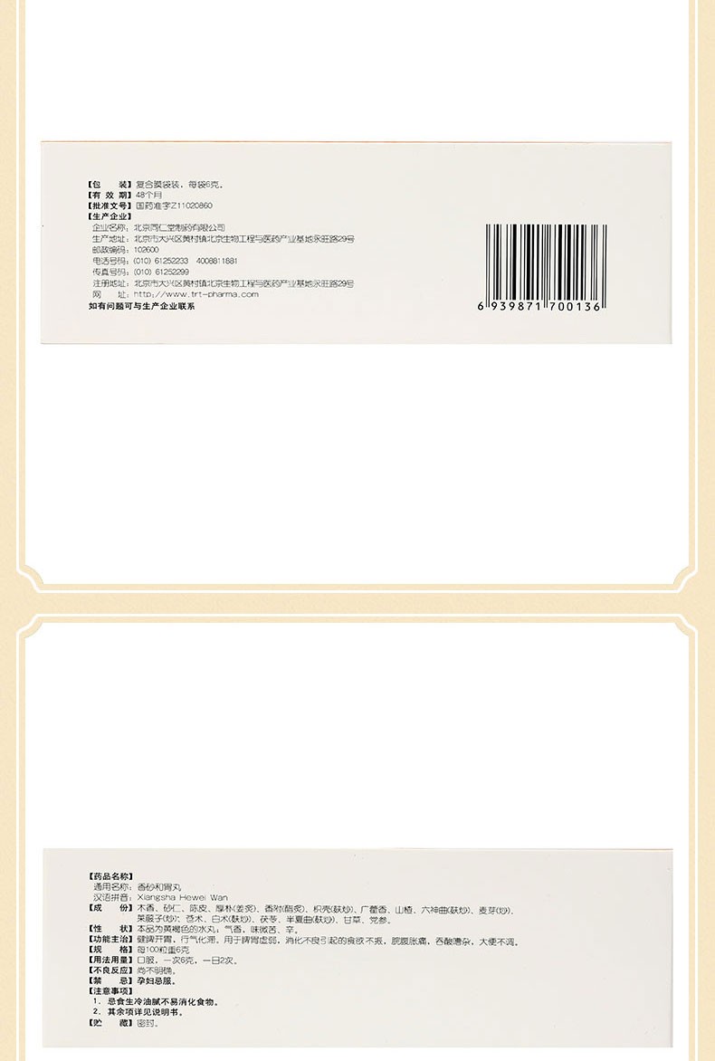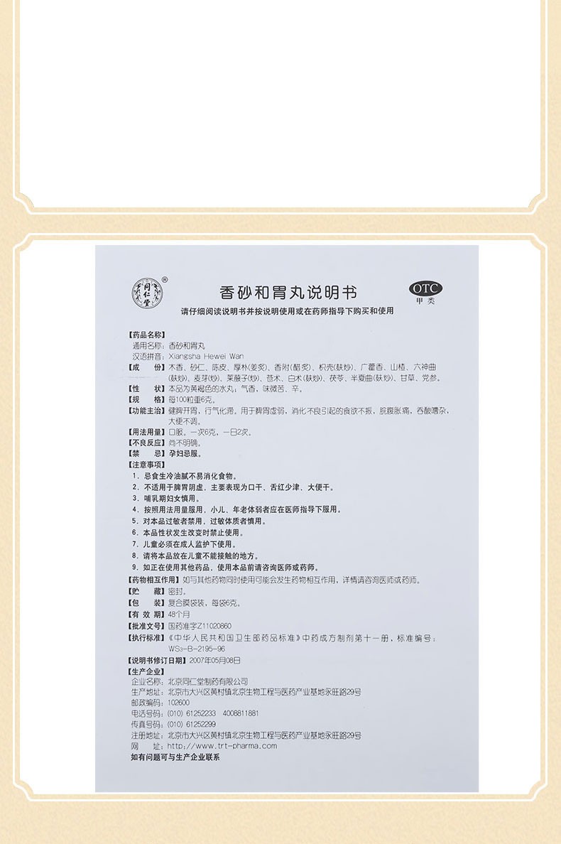 同仁堂(TRT) 北京同仁堂 香砂和胃丸6g*12袋 脾胃虛弱 消化不良 腹脹吞酸大便不調(diào)水丸